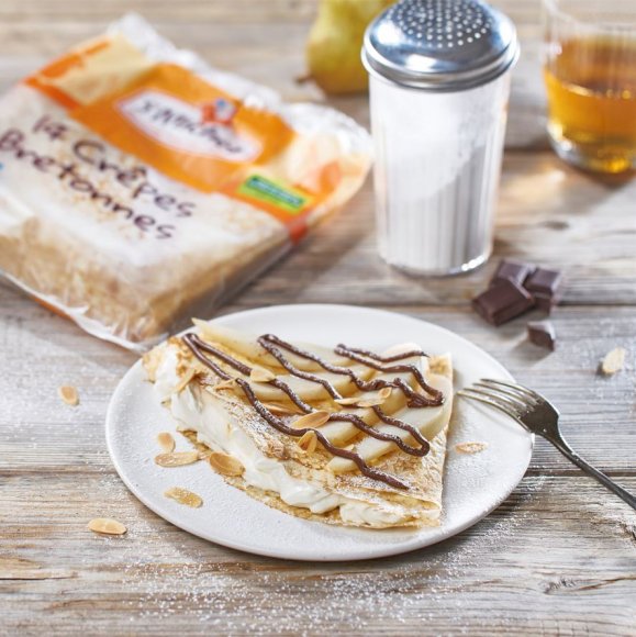 - Déposer la crème foutée généreusement sur ¼ de la crêpe, puis rabattre l’autre moitié sur la crème.